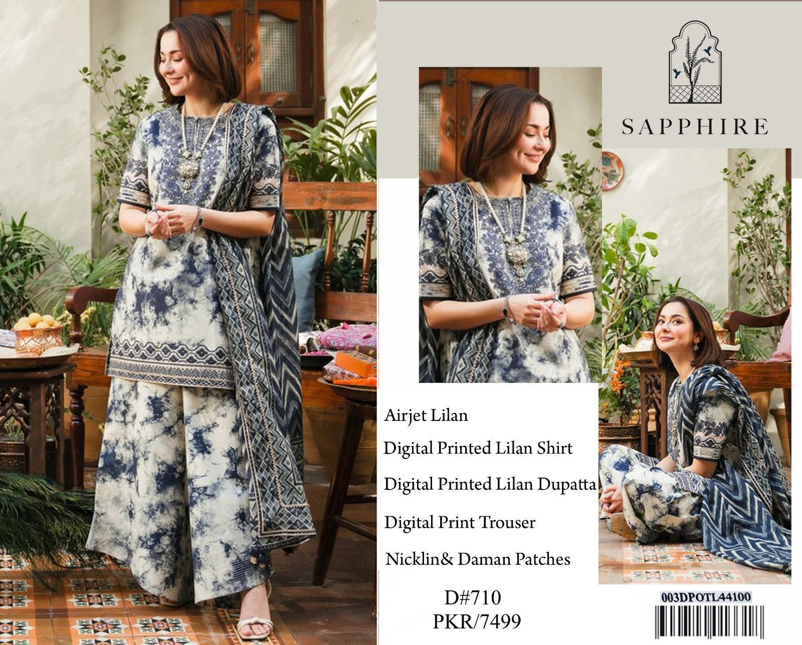 *SAPHIRE LINEN WITH LINEN DUPATTA* *LINEN 7272 DIGITAL PRINT* *FABRIC*: Diamond Linen 7272 *100%* guranted. ➡️Digital printed shirt Diamond 7272 ➡️ NECK & Sleeves Patch ➡️DAMAN HEAVY PATCH ➡️DIGITAL Printed Dupatta Diamond 7272 ➡️DIGITAL Printed Trouser.7272